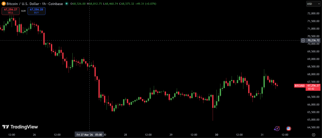 Technicals (H1): On the H1 timeframe, price has broken above a short-term bearish trend line but remains below the 200-period moving average. The 50-period MA is sloping upward but has not crossed above the 200-period MA. RSI is near 55, showing modest bullish momentum. MACD is positive with rising histogram bars. Key resistance sits at 68,500 and 69,500. Key support sits at 66,800 and 65,000.