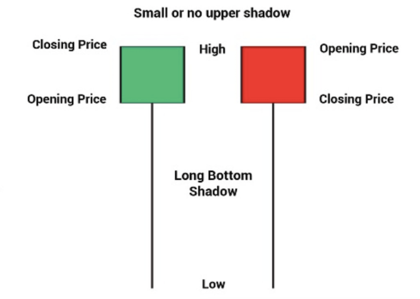 The color of the body offers additional clues about the strength of the reversal. A green hammer pattern indicates that buyers maintained control from the open to the close, reflecting stronger immediate conviction. A red hammer pattern shows that sellers initially pushed prices lower during the session before buyers ultimately reversed the move. While color provides useful context, it does not determine the validity of the pattern itself.
