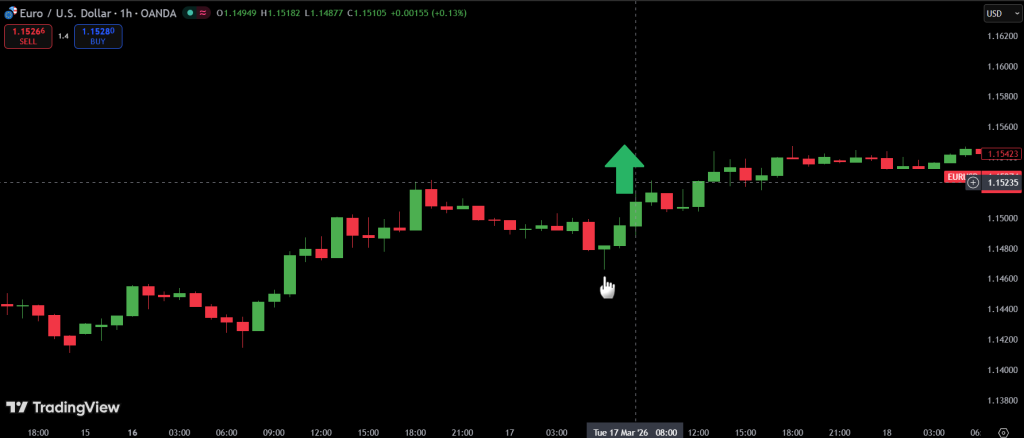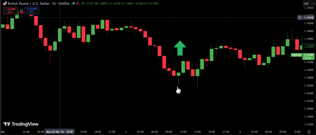 During the session, sellers push prices significantly lower. This creates the long lower wick that defines the pattern. At this moment, it appears that bears are in full control, and traders who are watching may expect the decline to continue. Fear and pessimism dominate as prices test lower levels.