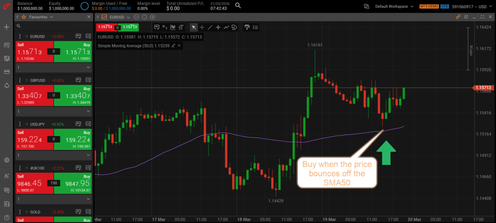 For a long (buy) trade: Price must be above the SMA50 with the SMA50 sloping upward. Enter when price pulls back and touches the SMA50, then forms a bullish candlestick such as a hammer or bullish engulfing. Place the stop-loss 5 pips below the SMA50 and set the take-profit at 10 pips.