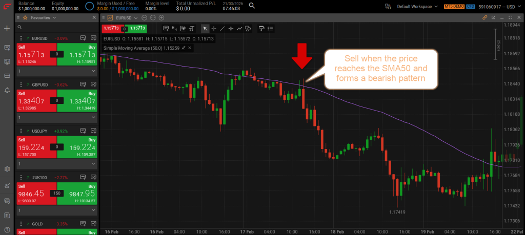 For a short (sell) trade: Price must be below the SMA50 with the SMA50 sloping downward. Enter when price rallies back and touches the SMA50, then forms a bearish candlestick such as a shooting star or bearish engulfing. Place the stop-loss 5 pips above the SMA50 and set the take-profit at 10 pips.