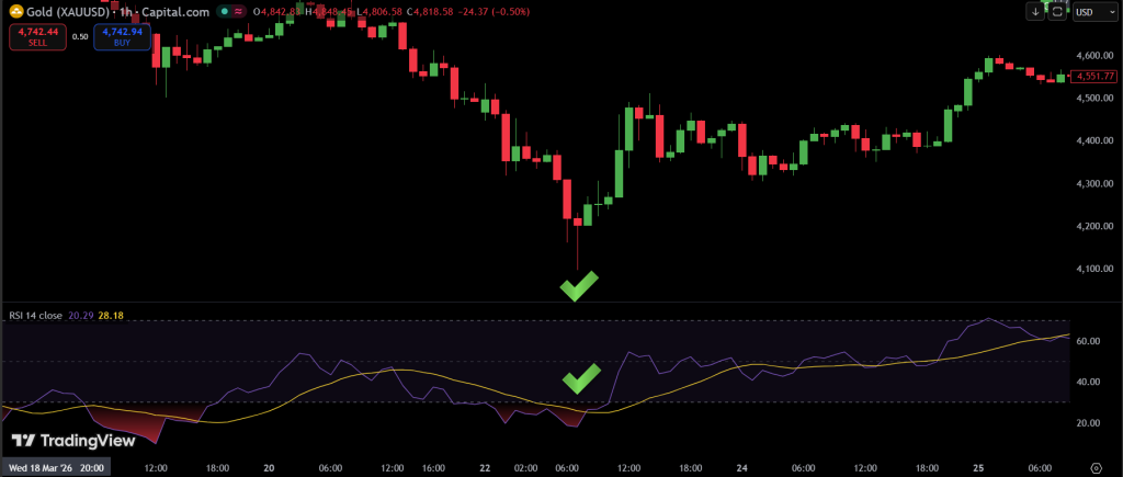 A strong setup appears when a hammer RSI signal forms while RSI is below 30. This suggests that selling pressure is exhausted and buyers may take control.